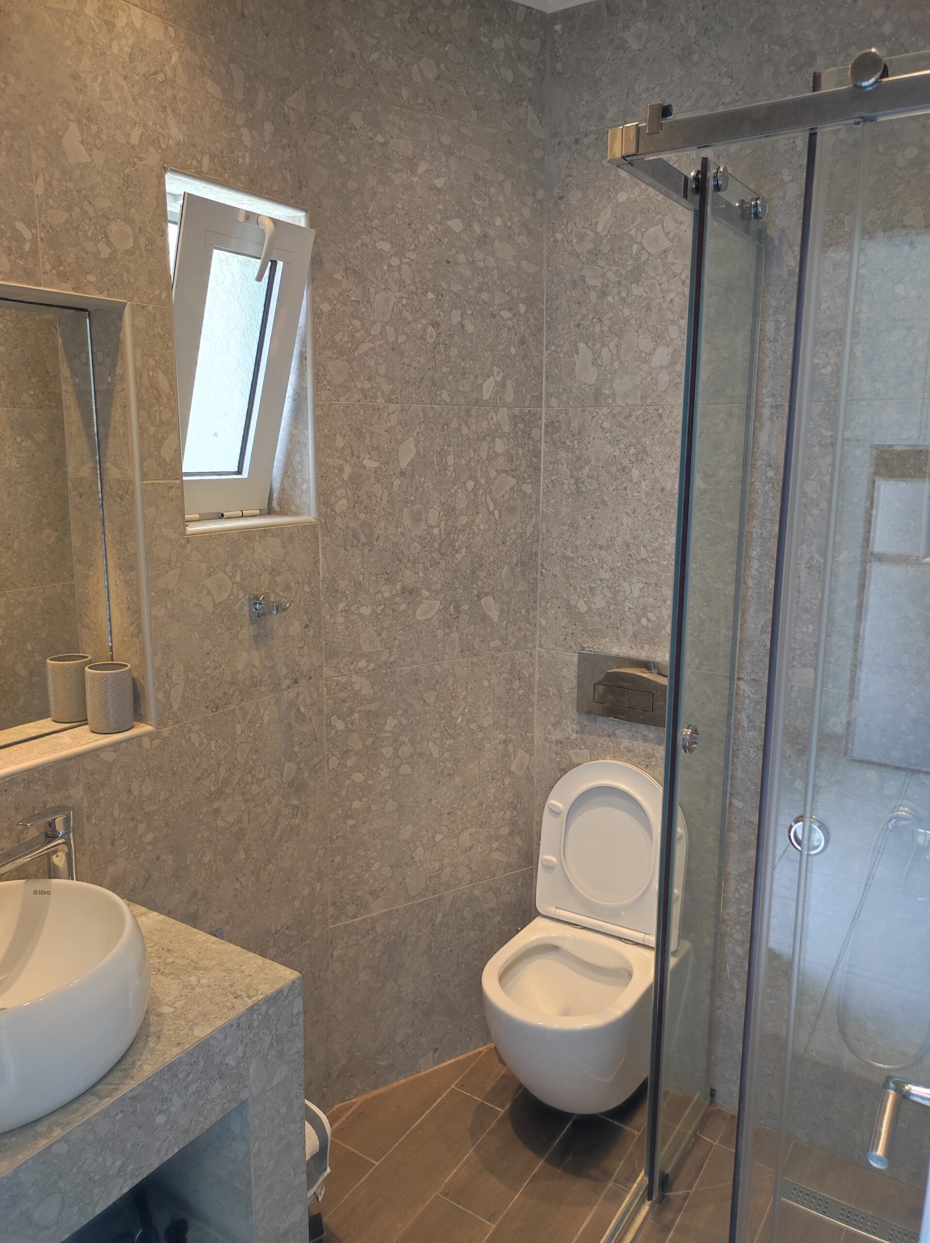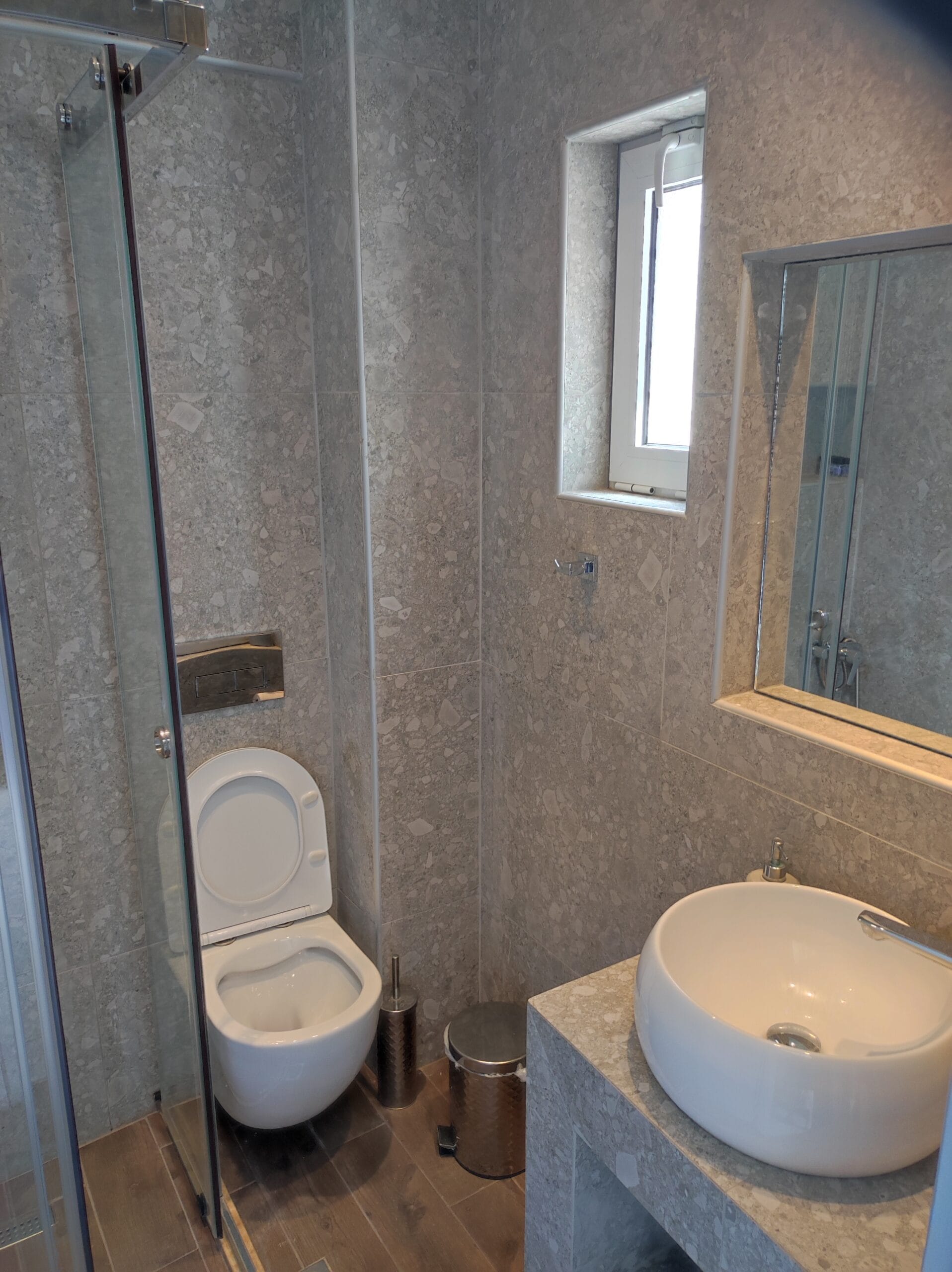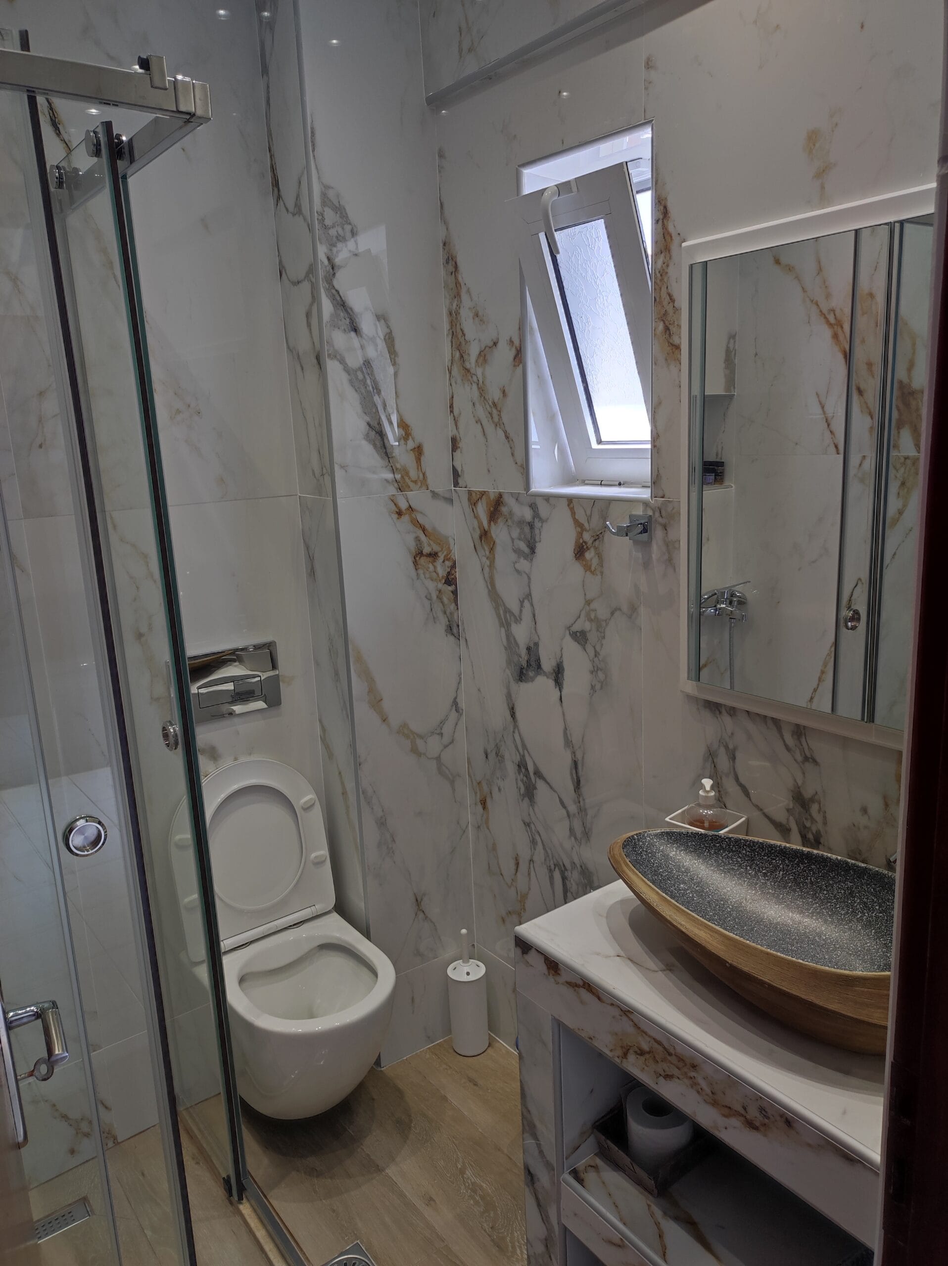 Ιδιωτικό μπάνιο με ντουζιέρα και προϊόντα περιποίησης